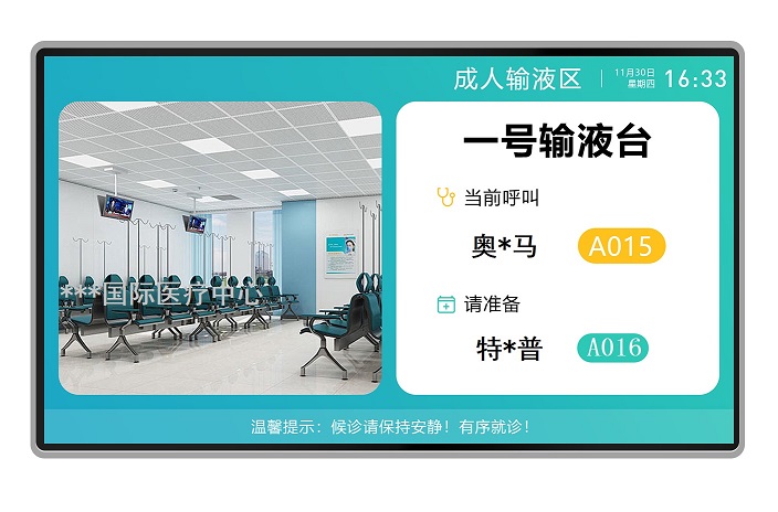 输液治疗排队叫号系统是由排队叫号服务管理平台系统、软件叫号器、综合液晶一体机(等候区综合显示屏,常规43-65寸)、窗口显示液晶一体机(窗口上方液晶显示屏,常规32寸)、自助签到机组成,其中将音箱喇叭集成到液晶一体机中,也可以外接功放和音箱。